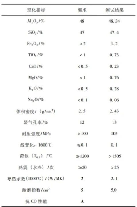沸騰氯化爐內(nèi)襯材料主要采用Al₂O₃和SiO₂,物相組成主要為莫來石,主要化學(xué)成份及物理性能測(cè)試見表1。