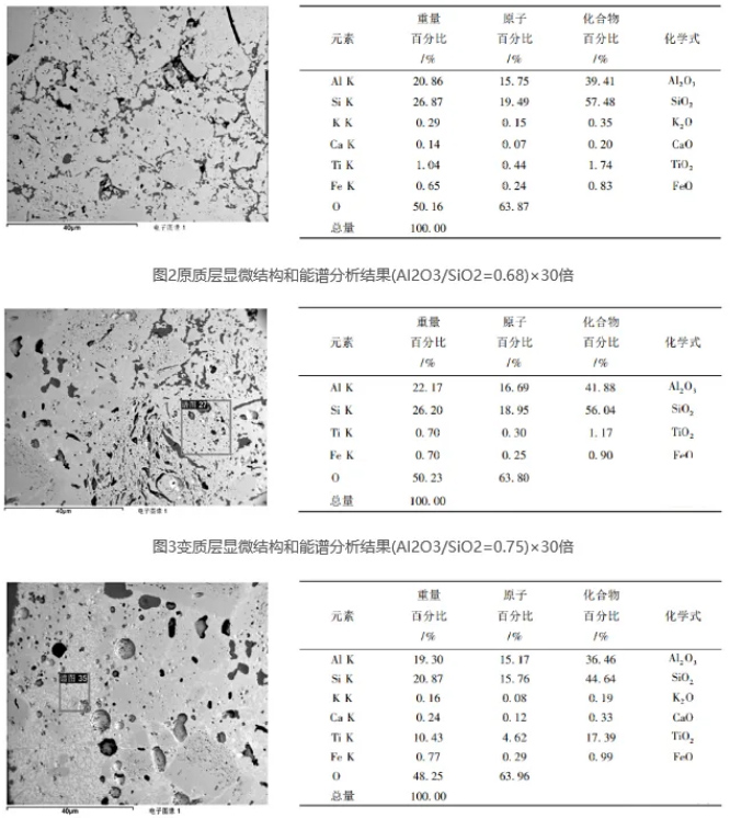 從熱力學(xué)上看,Al₂O₃-SiO₂系材料[4]各物相在氯化反應(yīng)中:莫來石相(A₃S₂)非常不穩(wěn)定,其成份見表2,石英相(SiO₂)非常穩(wěn)定,剛玉相(Al₂O₃)居中;在碳熱還原中:石英相非常不穩(wěn)定,剛玉相非常穩(wěn)定,莫來石相居中。在實(shí)際中,爐襯材料是如何損壞的,其過程是怎樣發(fā)生的,這要從殘磚顯微結(jié)構(gòu)分析入手。