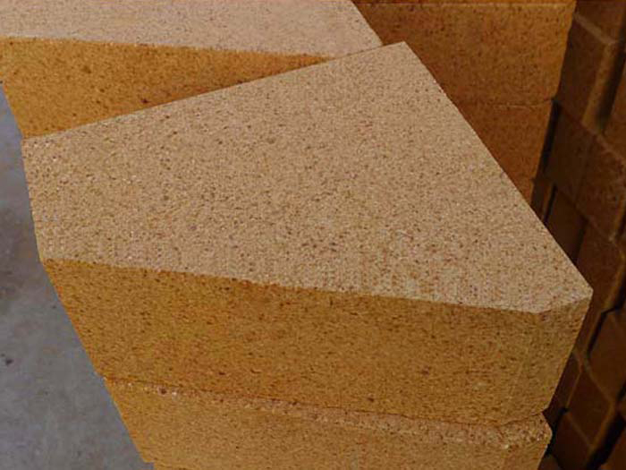 拱腳粘土磚是用50%的軟質(zhì)粘土和50%硬質(zhì)粘土熟料,按一定的粒度要求進(jìn)行配料,經(jīng)成型、干燥后,在1300~1400℃的高溫下燒成。粘土耐火磚屬于弱酸性耐火制品,能抵抗酸性熔渣和酸性氣體的侵蝕,對(duì)堿性物質(zhì)的抵抗能力稍差。粘土磚的熱性能好,耐急冷急熱。