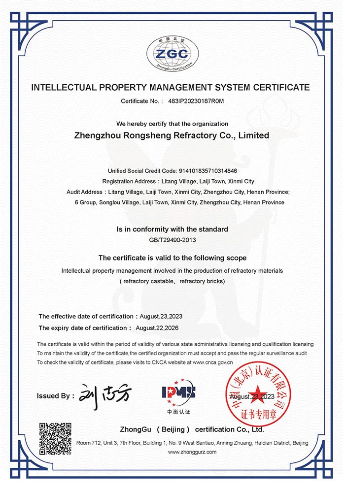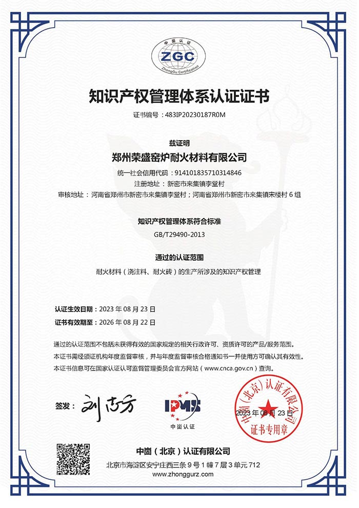 發(fā)布時(shí)間:2023/8/24 11:49:46 點(diǎn)擊率: 來源:高鋁磚廠家 作者:榮盛耐材近日,鄭州榮盛窯爐耐火材料有限公司(以下簡稱「榮盛耐材」)順利通過國家知識(shí)產(chǎn)權(quán)貫標(biāo)認(rèn)證,并獲得了《知識(shí)產(chǎn)權(quán)管理體系認(rèn)證證書》中英文雙語認(rèn)證。該項(xiàng)認(rèn)證的順利通過,標(biāo)志著榮盛耐材構(gòu)建了一套規(guī)范化、系統(tǒng)化、程序化、精細(xì)化的知識(shí)產(chǎn)權(quán)管理體系。